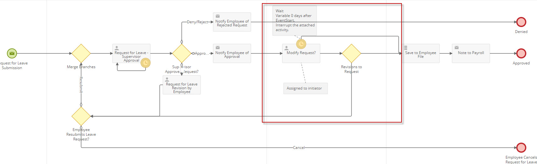 Wait until variable StartDate equals today. If above task isn't acted upon by the date they take their vacation, proceed to save to repository task. I've attached the process diagram and I've added an exclusive gateway where I think something like this would go (see red box).