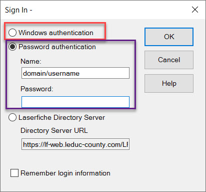 However, if during the initial user set up/authentication for the LF ribbon in an Office application (Word/PPT/Excel/Outlook) the repository is attached and authenticated against with Windows credentials (red box in image), the parent folder template does not get applied as a default, and tokens do not populate in the metadata fields when you save a document into Laserfiche from the Office application - fields are left blank instead and must be manually filled in.