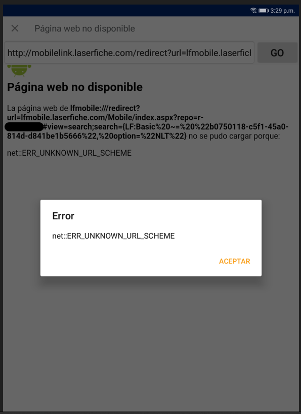 We are creating a business process for the customer using LF Cloud, a tablet and a cell phone (Android) its a simple form that have a couple of fields, one of those fields its a link to a document in the repository. We are using this format for the url 'http://mobilelink.laserfiche.com/redirect?url=lfmobile.laserfiche.com/Mobile/index.aspx?db=repo#id=2091' and this one too 'http://mobilelink.laserfiche.com/redirect?url=lfmobile.laserfiche.com/Mobile/index.aspx?repo=repo#view=search;search={LF:Basic ~= \"" + search_parameter + "\", option=\"NLT\"}' but when we use the mobile app it generates the error 'ERR_UNKNOWN_URL_SCHEME'. At this moment we are not sure if our links are bad or we are missing some config on the devices.
