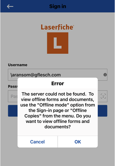 We are getting the following error: (The server could not be found. To view offline forms and documents, use the "Offline mode" option from the Sign-in page or "Offline Copies" from the menu. Do you want to view offline forms and documents?) during the sign-in process to get into the LF App.