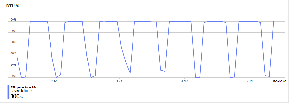 We are currently using S1 - 20 DTU's and as per the image, every 15 mins something is running which maxes out the server. The application itself seems to have no performance issues as far as I can tell.