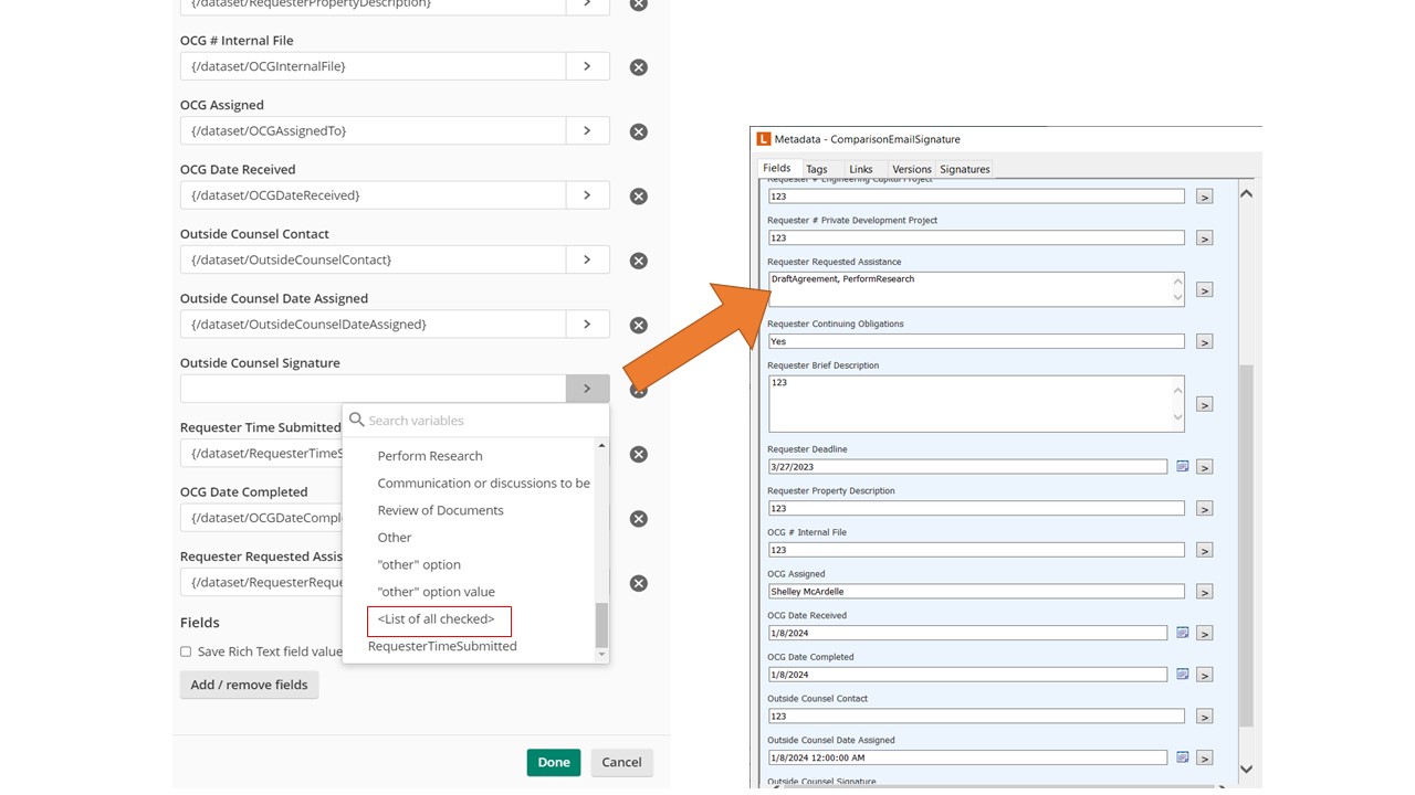 I am currently working on a form that includes a multiple-choice section. When assigning metadata values based on the selected options within this section to my files via the form, everything works seamlessly using the <List of all checked> option (refer to the first image). However, I encounter an issue when attempting to implement the same option in Workflow Design.