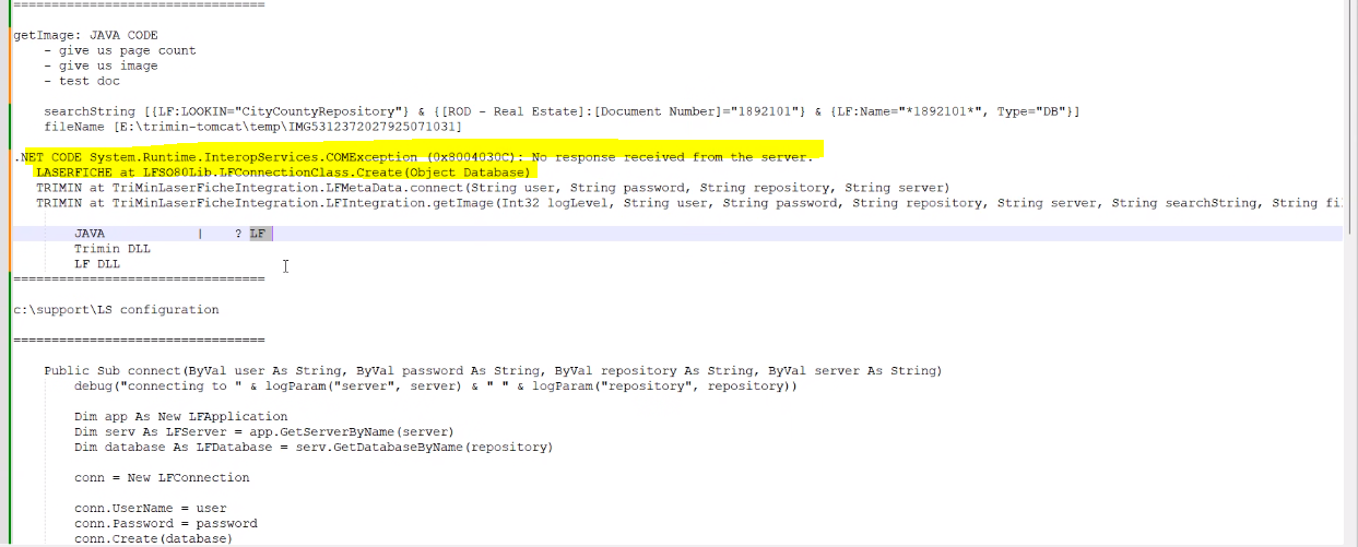 We have an interface with a vendor named Trimin to display images from Laserfiche.  However they have been seeing the attached errors every once in a while, not consistent and no errors show on Laserfiche servers Event Viewers.  They also seem sluggish when retrieving documents, again not consistent and want to verify that it is not a Laserfiche issue.  They keep mentioning an LFSO08.LIB file that is used to call the items from Laserfiche but can't provide us with this Library, and am wondering if anyone else has ever had issues with the vendor?  Or if anyone has anyother ideas as to if there would be any other logs that I can look for regarding the .LIB file.