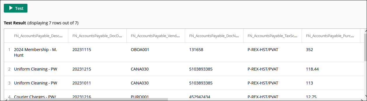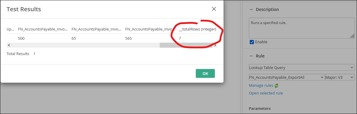 This is in Laserfiche Cloud. I am unable to retrieve multiple rows from the Run Rule Workflow Activity. I have a query that returns all rows of a lookup table. In the example, I have 7 rows, which is displayed correctly when I test the query; however, when I test the rule activity in workflow, it only ever returns 1 row. Even if I iterate using a For Each Row activity, it correctly iterates 7 times but cannot find the corresponding value in each row so it returns a blank.