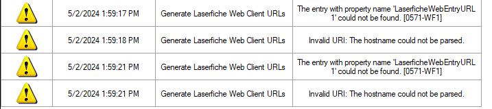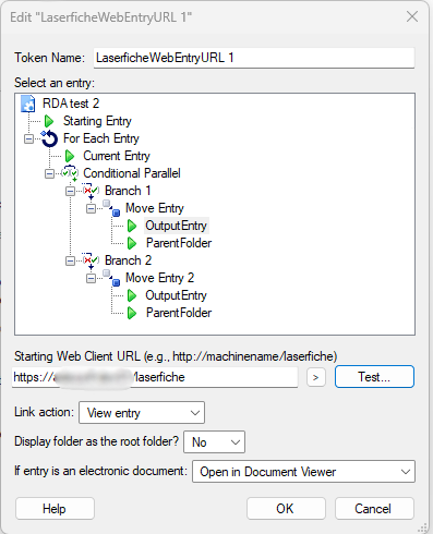 The Generate Laserfiche Web Client URLS is the one throwing the error where I am attempting to pass it the Move Entry Output entry token to generate a link that I can then send via email to recipients to use to view the newly processed pdf files. I have attached the error pictures as well of what is generated when you try to run this workflow. Any help would be greatly appreciated, as Full Path and ID also don't work. It seems that you must specify an entry without being able to pass it through a token to complete the URL. Thanks in advance!