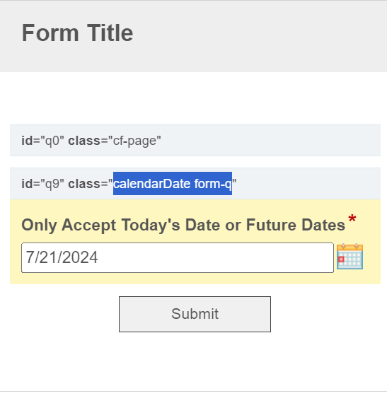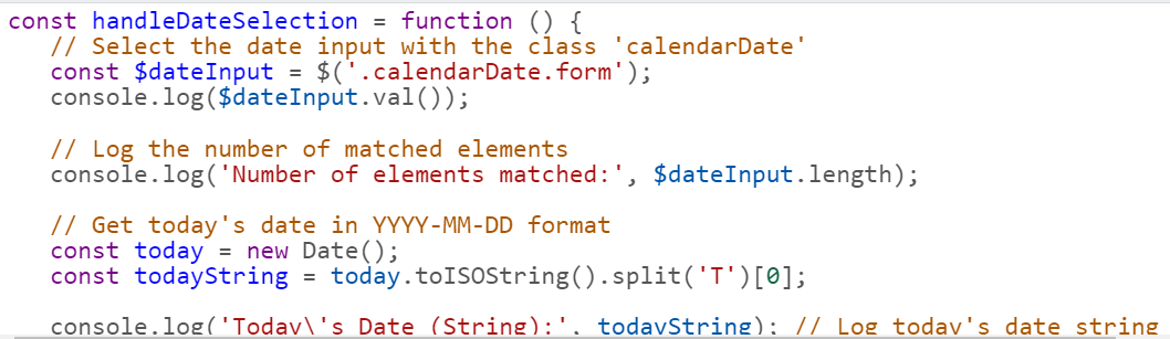 I would l like to ask for assistance.Each time i click the date picker with the class name calendarDate form-q the val is equal to zero so i would like to be corrected on what i am doing wrong
