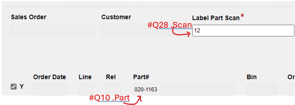 The Part field populates from a SQL lookup. The user would scan a package and the Part value will fill the Part Field. What I am attempting to accomplish is to compare the value of the Part field with the value of the Scan field after the scan field changes to populated. If they match, change the Collection row background to green and if they do not match, change the background color to red.