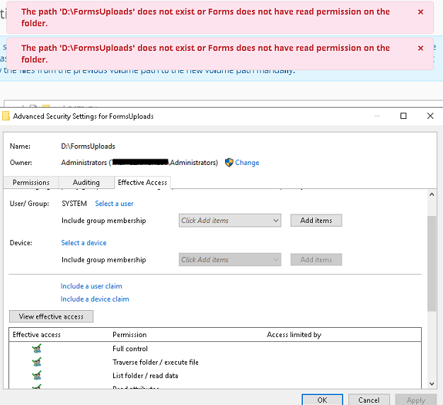 Why is forms giving me this error to access a folder on the D disk? If I check effective rights it says that System has full control of the folder since System gets access to every local disk on a Windows OS.