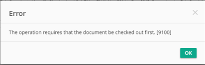 Occasionally, our users are receiving an error that says "The operation requires that the document be checked out first. [9100]". When the error occurs, the one thing that seems to be a commonality is that the user has added an annotation. In most cases, after the answer Ok is selected, all changes, including the annotation, are saved. Although I have witnessed one case where the changes did not stick.