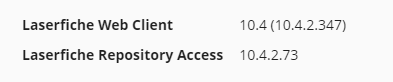We are using Laserfiche Web Client, version 10.4.2.347 and Repository Access version 10.4.2.73. We are self-hosted.