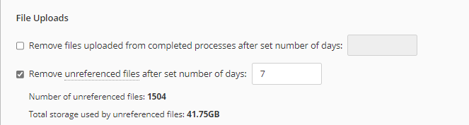 I've got the "Remove unreferenced files after set number of days" ticked as seen on the snip and the number and size of unreferenced files too. It seems like it's not working in this situation because most of the forms they've submitted are more than 7 days ago already.