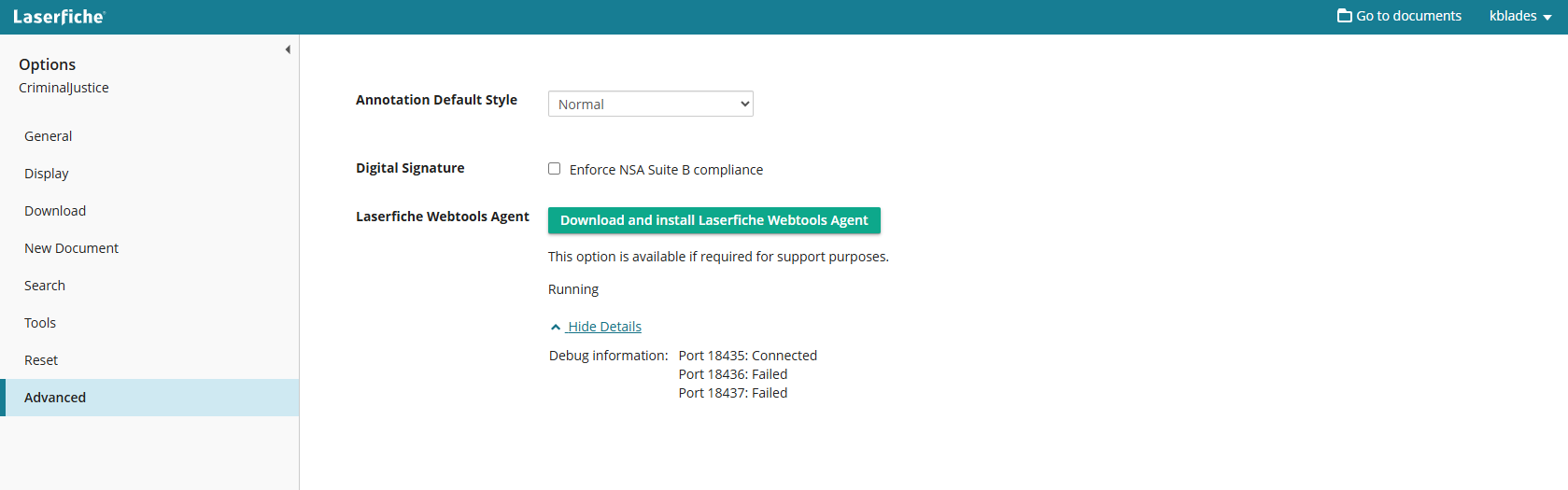 Go to Options\Advanced in the web client on that computer, does Laserfiche Webtools Agent show as running?