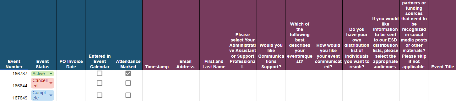 We are self hosted on v11 and I am newer to LF. We have a New Event Request Form currently in a Google form that users complete and the answers go to a shared Google Sheet as responses come in. The responses are then separated out to tabs by department for actions and tracking with a formula. Examples of additional columns that are manipulated as new data is created by the form: When the event is entered into our registration program, it generates a number which is added to a column. There is a dropdown for the status of the event to quickly see which events are active, cancelled, completed, etc. There is a place to put a PO Invoice date when that is generated. There is a checkbox for when attendance was completed.