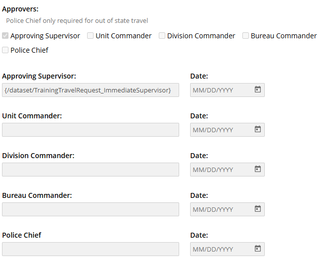 My organization uses Laserfiche 11. I have two forms. One form is a travel request that has a list of approvers and a date that the approver approved the form. The user has the option to select which approvers are needed. Each selected approver will receive a task to complete the approval. The other form is a copy of the first form along with some other fields added that are needed by our travel/fiscal services department. Once all approvals are complete, the form is sent to our training center commander for review. Once the review is complete, the admin aide will be sent the same form for final review. When the training center commander gets the form, the approver fields show the correct information. My issue is when the admin aide gets the form for review, the approver fields are blank. I am adding a screenshot of the approver and a screenshot of the process diagram. Any help would be appreciated. Thank you!