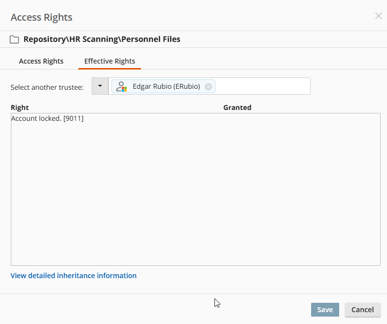 When I look in the repository and try to view the Access Rights Effective Rights for the user, it says "Account locked. [9011]". The user account is an AD account. Why would it say that the account is locked?