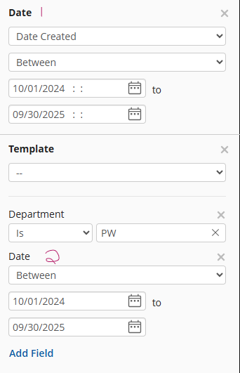 I have a template that has fields for Date and Department, among others. Two users were attempting to perform a search in the Web Client filtering to the built-in Date field with Created (1) between 10/1/2024 - 09/30/2025 and selecting different Department options. Searches for most of the Departments worked perfectly, but there were two that spun the search box indefinitely. I can do the exact same search and retrieve results immediately, even across VPN. When I had the problem users switch to using the template's Date field (2) instead it works normally.