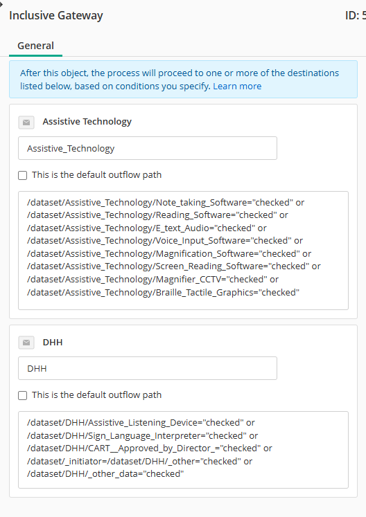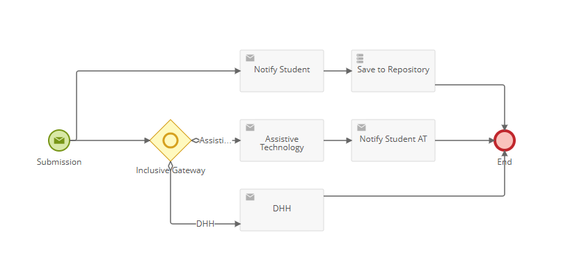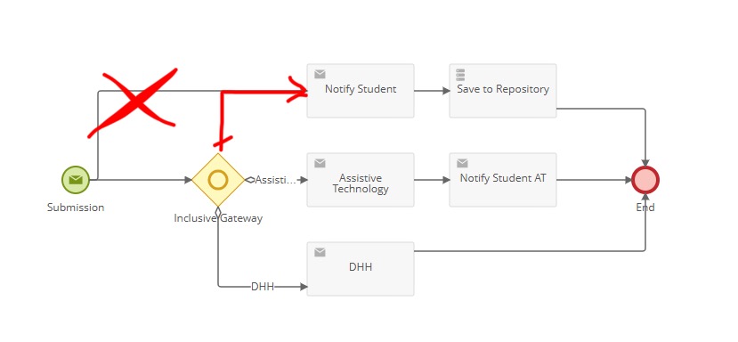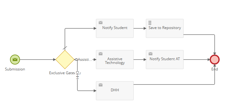 The student is getting the notification email and the submitted form is also saved on the repository, so the process is "working". Not sure why I am getting this error message when none of the boxes under the Assistive Technology and DHH fields are checked. Here is the process diagram