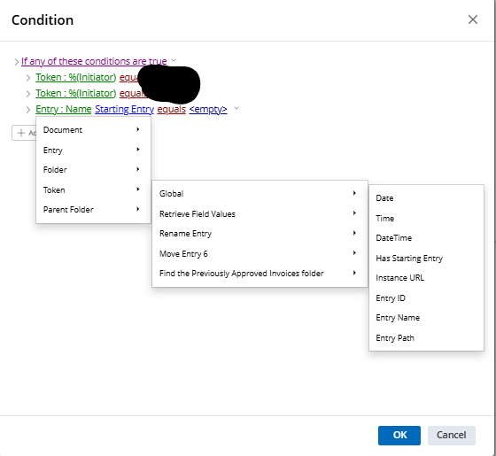 Hopefully I'm just missing something simple here. I have a workflow with a Conditional Sequence activity that evaluates the %(Initiator) token. In the screenshot below, you can see that I have two conditions that both pertain to that token. This workflow was built years ago, and now I'm trying to add an additional condition using the %(Initiator) token, but I can't figure out where it is, nor do I see an option for Token Dialog.