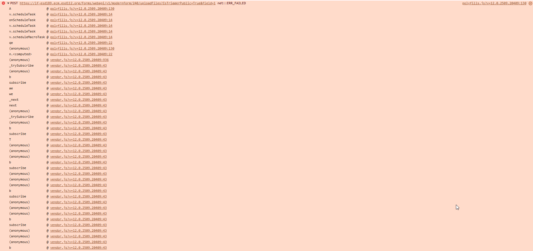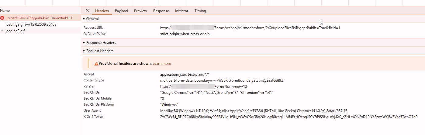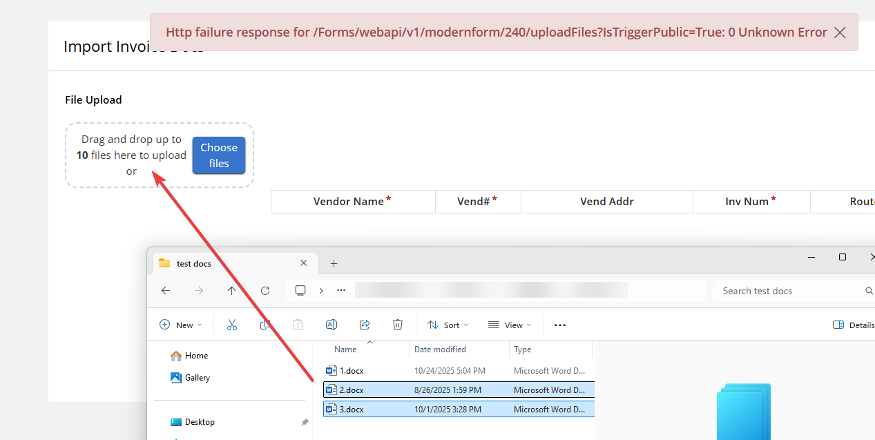 Http failure response for /Forms/webapi/v1/modernform/240/uploadFiles?IsTriggerPublic=True: 0 Unknown Error