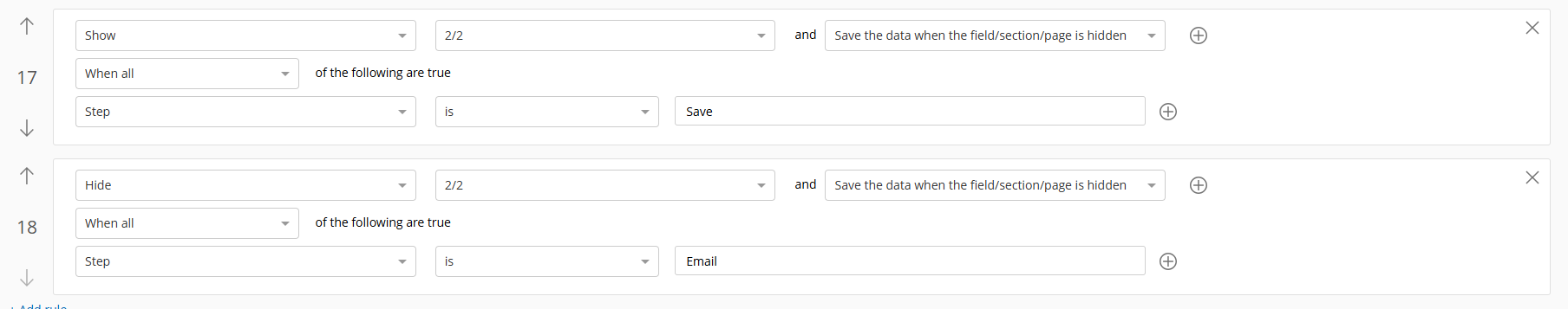 I see an option in the field rule to hide page 2 but not the step name populates in the condition section