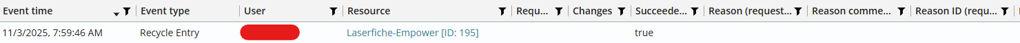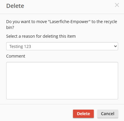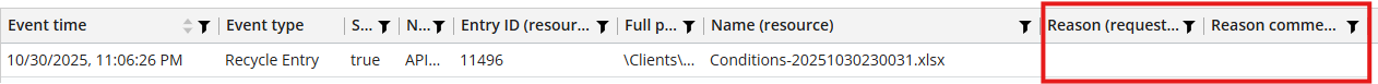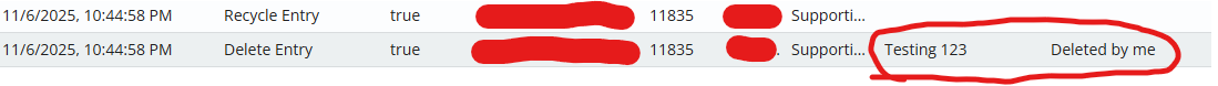 I want to delete an entry and state the reason for deletion through the API. Because our web app interacts with the Laserfiche repo, I want to log the actual user who deleted the file from our web app as a reason so that it is visible in LF Audit Trail. I tried using the DeleteEntryWithAuditReason class with the Comment property, but in Laserfiche Audit, nothing shows up for the reason for that deleted Entry.