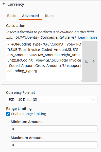 =IF(OR(Coding_Type="AFE",Coding_Type="PO"),SUB(Total_Invoice_Coded_Amount,SUB(Gross_Amount,SUM(Tax_Amount,Freight_Amount))),IF(Coding_Type="GL",SUB(Total_Invoice_Coded_Amount,Gross_Amount),"Unsupported Coding_Type"))