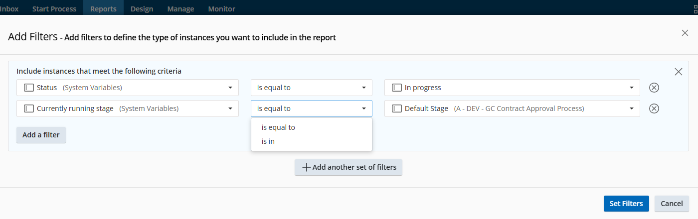 Filter to allow Department is equal to "XYZ" and current running stage is not equal to "Default Stage"