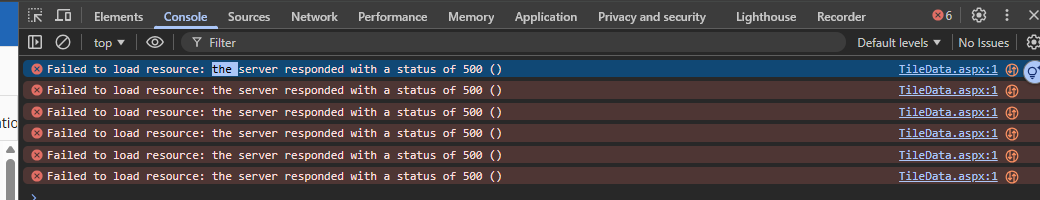 All I can see in the console log of the browser is the HTTP 500 errors (for the missing tiles) from the TileData.aspx.
