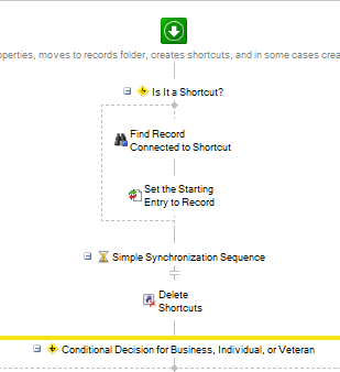 To enable this workflow to apply changes to documents that already exist in the repository where someone might change a field on a shortcut that requires it to run again, there is a step at the beginning that checks to see if it is a shortcut and will delete the original one. From there the decisions begin, is it a business, individual, or veteran account based on template. After that, depending on document type, all sorts of things happen.