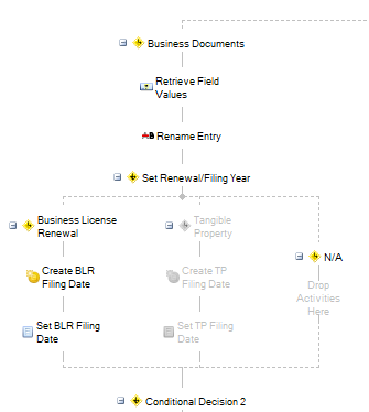 So let's say I was working on reprocessing the docs in the records folder associated with group C-2, I could disable primary branch A, primary branch B, and secondary branch C-1 then process those that I know meet C-2 criteria so that all the work is following a vertical, vs horizontal conditional process.  Then follow suit with each remaining branch.