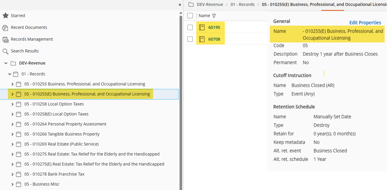 I need a search syntax to use in Workflow that will return the record folders that are part of a particular record series. I have set up an example in our development environment. In the image below, I would need my search to return the folders named 60195 and 60708 by searching for folders that are in the record series you see listed. I either get only the record series itself as a result (despite using Type="F"), not the record folders, or I get no results at all. I've tried using wildcards, using and not using the code as part of the name, etc.