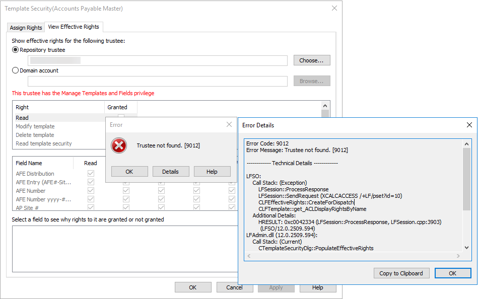 I have a user that is not able to edit a field in a template, so I have been trying to figure out why. One of the things I am trying to do is look at the Effective Rights on a template for the user in question. When I go the "View Effective Rights" tab and click the "Choose" button for "Repository trustee" I am able to select the user from the list provided. Once I select the user though I get the error "Trustee not found. [9012]". How can the trustee not be found when I just selected it from the list Laserfiche provided?
