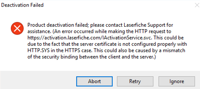 You are likely seeing this error because Laserfiche removed lower TLS protocols (1.0 and 1.1) from the activation server in May of 2025. You will need to use an updated activate tool from a newer version of the software to re/de/activate older software. KB 1014471 also provides a copy of the newer activation tool.