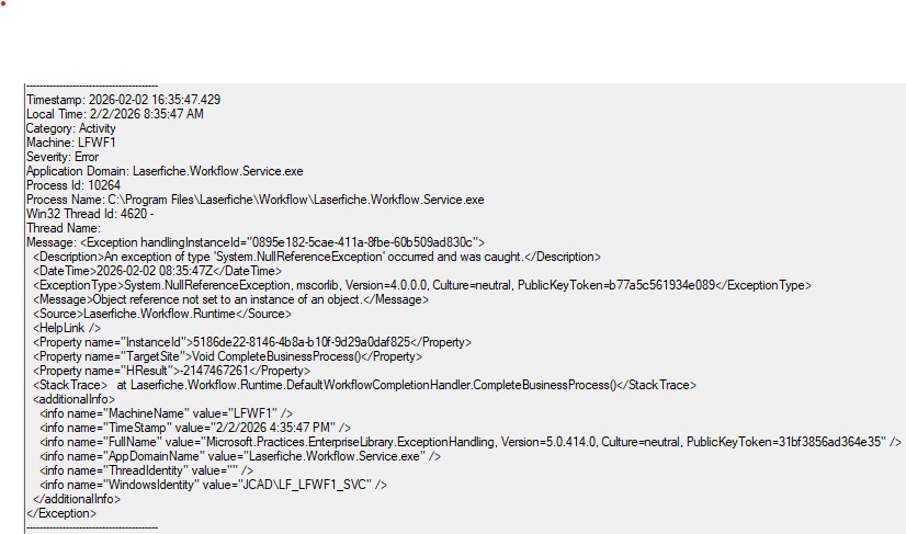 I have a workflow that schedules appointments to two different Outlook calendars based off of user selection for a Forms process. Last Friday around 7:30 Pacific, the Workflow started throwing the "Object reference not set to an instance of an object" error out of nowhere and is now unable to schedule anything.