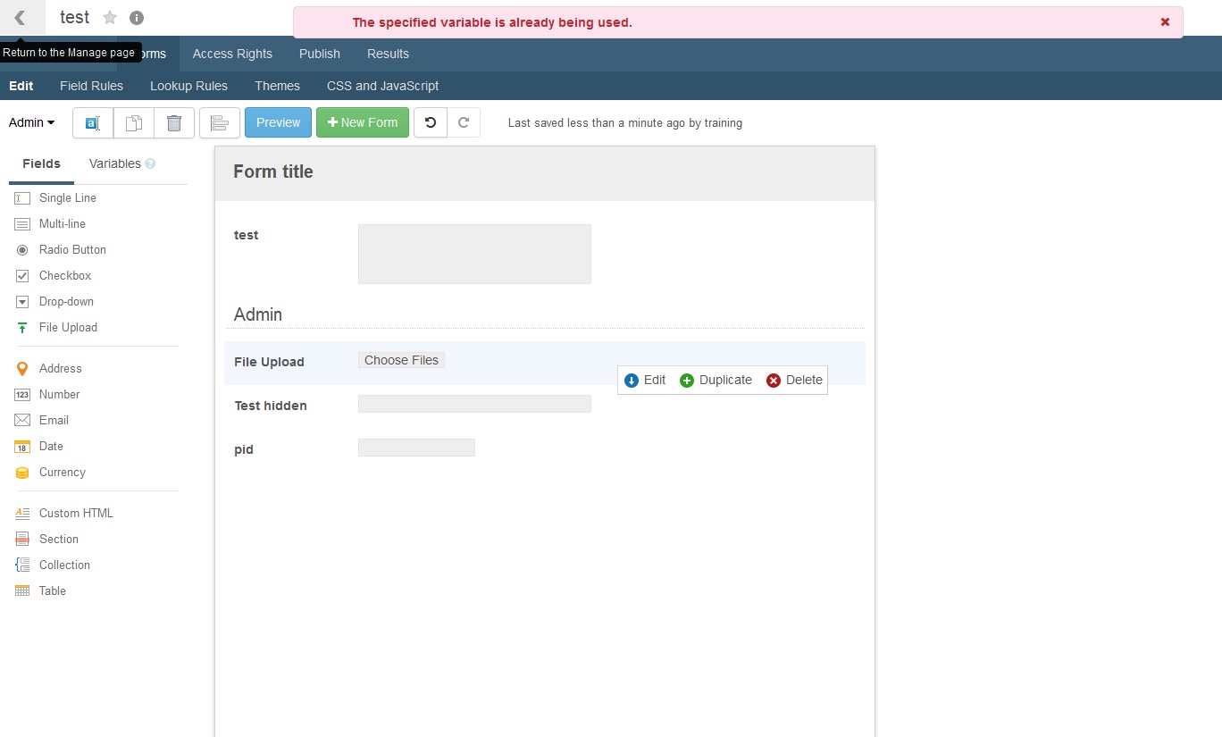4. Adding File Upload field in to the second form with the variable name from the first form created error below.