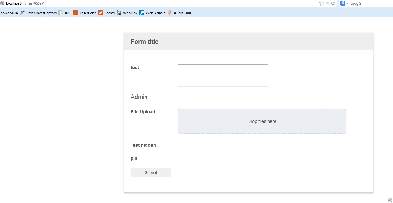 (http://localhost/Forms/8SSaP) Admin section appears:
