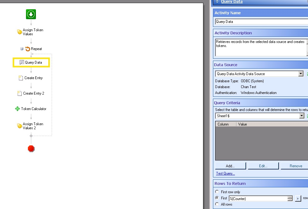 What we want to do is simply create a folder structure for all this information.  We want Workflow to read each row in the Spreadsheet and create a certain folder structure (based on the information across the row).  If I do a Query Data activity and can setup the ODBC and do a For Each Row.  However it only goes to the first row.  If I use a Custom Query I am unfamiliar with SQL syntax.