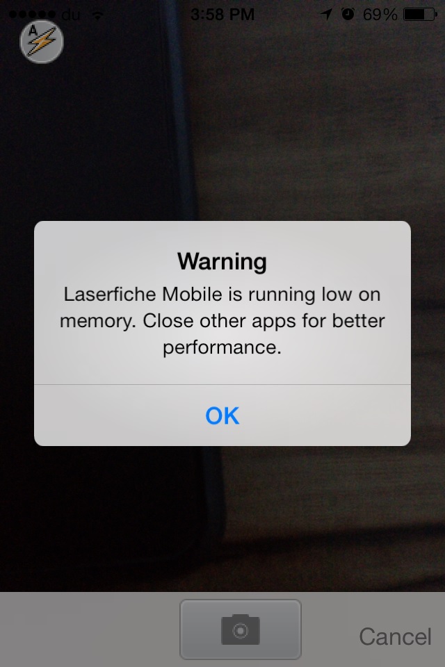 when ever i run the Laserfiche Mobile Apps(Ios) try to Capture document via Camera it shows me the warning message "Laserfiche Mobile is running low on memory. Close other apps for better performance". even there is no apps running. is anybody face the same issue ?