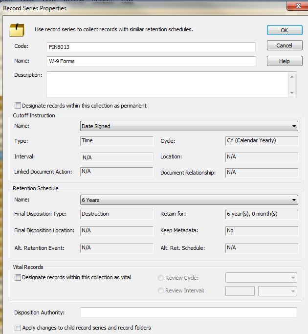My question is: what is the preferred or recommended practice for classifying the individual records to the retention? Are most organizations using dynamic fields, which allows the user to first select their department and then the particular record type? Example: (Template Field: Department): Finance; (Template Field: Record Type): FIN113 W-9 Form. Many retention schedules could have hundreds of record types, and using dynamic fields would narrow the choices for the user by department, otherwise they would have to choose from a very large list of all record types. Alternatively, are any organizations using BIG Buckets, where the user would choose from a list of actual retention times (i.e. 3 years, 7 years, Closed+7, etc.) This would not be the preferred as your relying on your users to know the specific retention of the record. Most if not all of my Laserfiche templates would contain the same dynamic field for Department & Record Type, so no matter what the record or department is, they can be tied to their repsective retention. Having these fields would also help with pushing the records to the proper Rec.Mgmt. folder by TRM workflow.