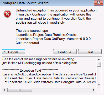 Laserfiche.NotLocalizedException: The data source type 'Laserfiche.Project.Data.Runtime.Oracle, Laserfiche.Project.Data.3rdParty, Version=9.0.0.0, Culture=neutral, PublicKeyToken=607dd73ee2bd1c00' could not be found.