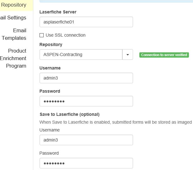 The admin user needs to be a completely new user, that never exists in your repository before. eg. in the ASPEN-Contracting repository, create a new repository user. Update the Username and Password in FormsConfig and click Save. Don't modify things in other tabs, login to Forms with this user.