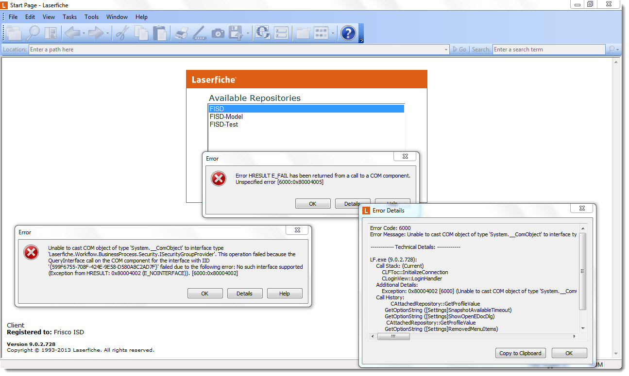 9.0.2 and 9.0.1 Laserfiche Client throwing errors connecting to 9.1 repository
