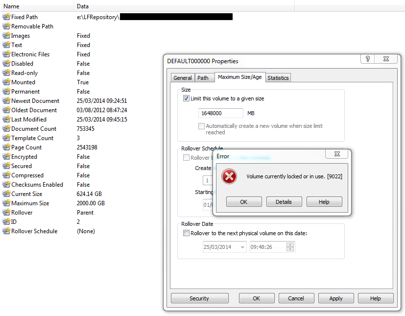 The Volume size is currently around 2TB and I want to set it to Rollover at around 1.6TB so there is some room for movement. I've done this before but in this instance i'm getting a message that the volume is locked or currently in use. The volume doesnt appear to be locked and i've attempted to do this task on a weekend to ensure its not in use.....to no avail. Please see below screenshot.