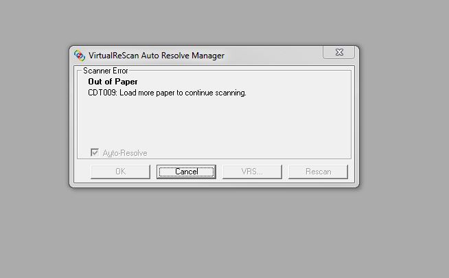 Have a user with a Fujitsu scanner receiving a prompt for CDT009 to insert more pages to continue scanning however the scan is complete. How do we get this prompt to stop populating? See error attached from user.