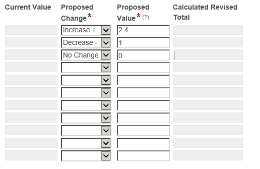 3. I want to have Current Value and Proposed Change(+,-,Nochange) and Proposed Value = Calculated Revised Total. Is it possible based on the selection for Proposed Change to add, subtract or have no change for the Calculated Revised Total? What would the Java script look like?