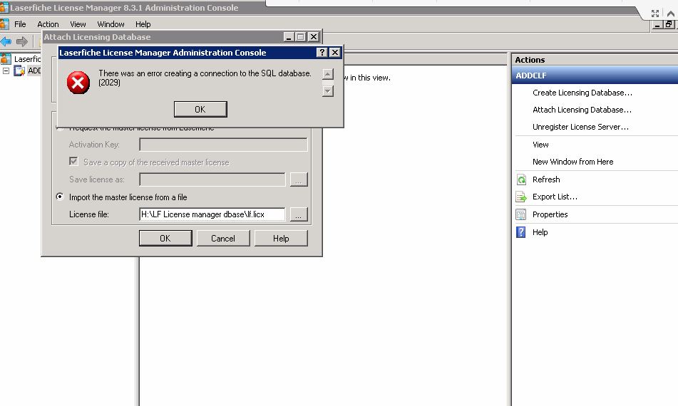 i am trying to attach license manager after  de-attaching it, and i got this error when i attach database