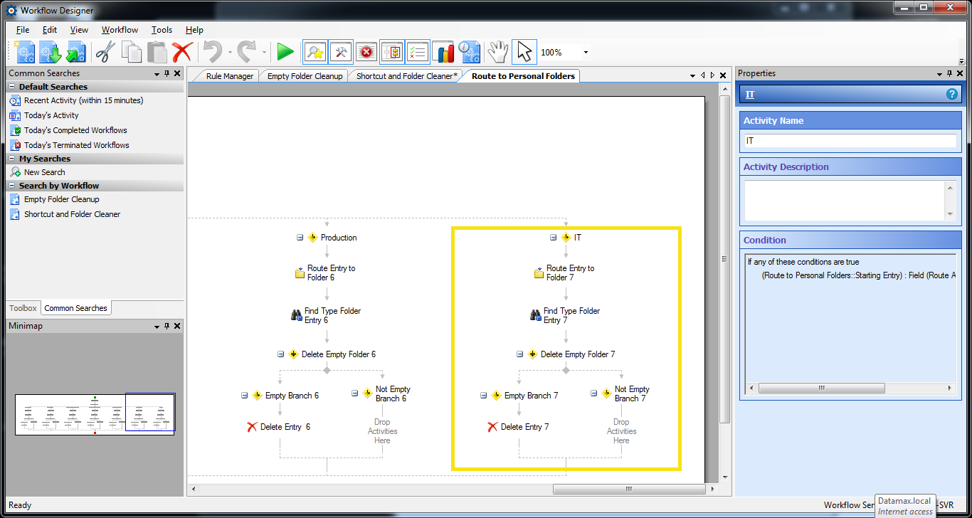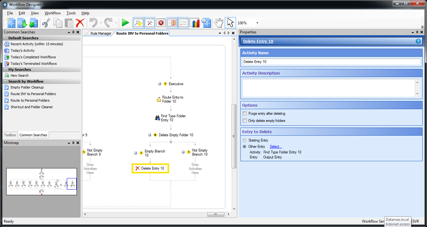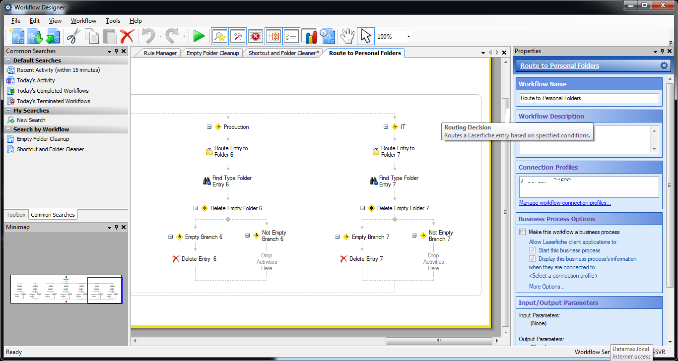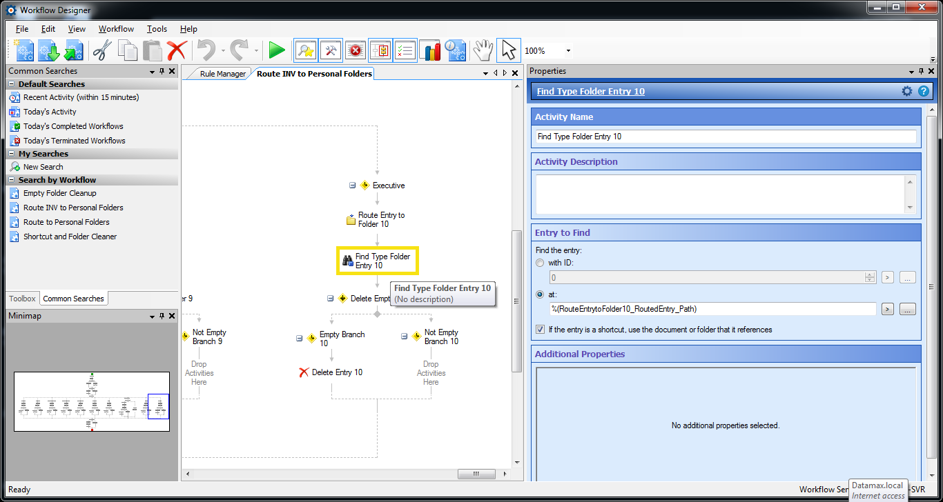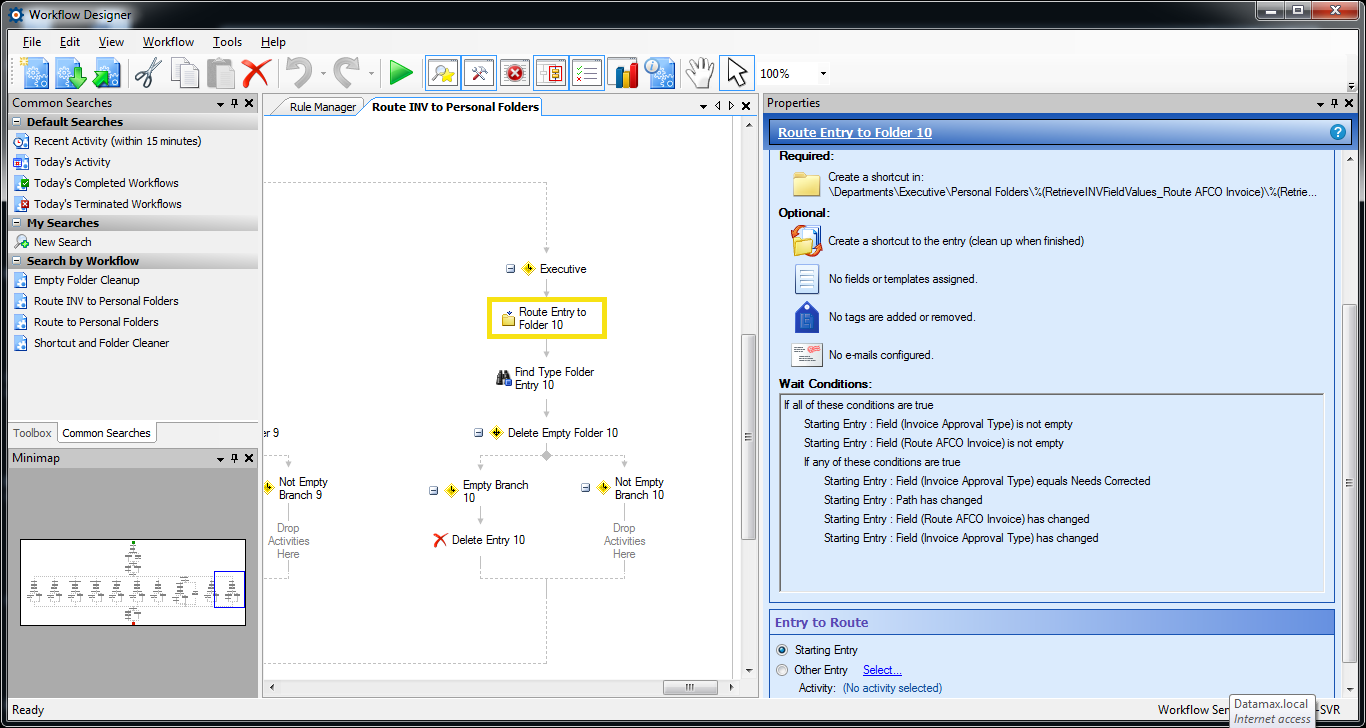 Comments: Have worked with Laserfiche PreSales and Support on various issues that occurred after the initial upgrade attempt. The client and I together fixed the FabTrol and MAS90 Query issues, script issues etc. Have rebuilt the workflow process many, many, times, trying different combinations of design, including using the search repository, and find entries, etc., but keep having issues with either getting the shortcut to move, or getting the folder to delete when empty. When one works, the other fails etc.