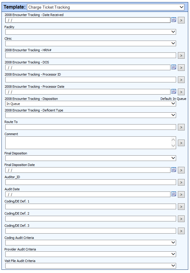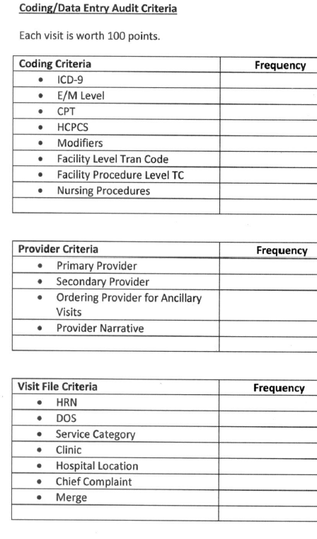 We are doing medical coding and processing with Laserfiche, and we are looking for a way to be able to audit the visits on several different criteria all within the same Laserfiche template. I have attached our current template and a sample of what we need to audit. The way we are doing this now is with sticky notes, and just writing in codes we created in the Coding/De Def. fields. We would like to be able to incorporate the auditing practice within the template, so we can export the metadata into excel and then grade each audited visit, but we are unsure of the best way to do this. The item that has caused the most problems is we need to be able to show a coder had an error with an ICD-9 and how many times it occurred, but if they didn’t have that error, it wouldn’t show up. If we had a way to select one of the coding criteria and then add number of errors would be perfect.