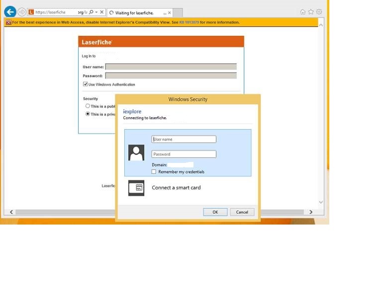 If i put in the redirected address https:\\laserfiche.clientdomain.com, web access will come up with a secondary windows login (see picture)