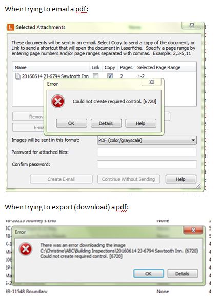 Error - Could not create required control 6720 when trying to email or export a pdf from Laserfiche.